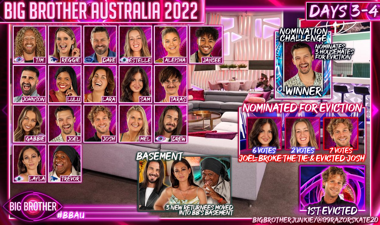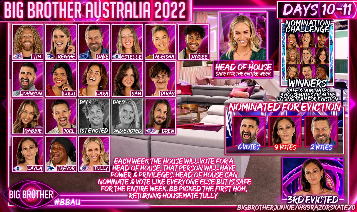 Inside the new Big Brother house. Who has already been evicted from the Big Brother Australia 2022 house. Mondays 840pm Live Big Brother Tuesdays 840pm Live Evictions Wednesday 840pm Nominations Thursday 840pm Big Brother Friday 800pm Big Brother check local guides Sunday 900pm Big Brother.